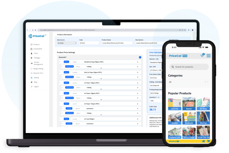 PriceCal is a powerful pricing tool designed specifically for printing businesses. It helps you set up pricing rules for your products (like business cards, booklets, banners, or flyers), automate calculations, and streamline your workflow—no complex setups or technical skills needed.