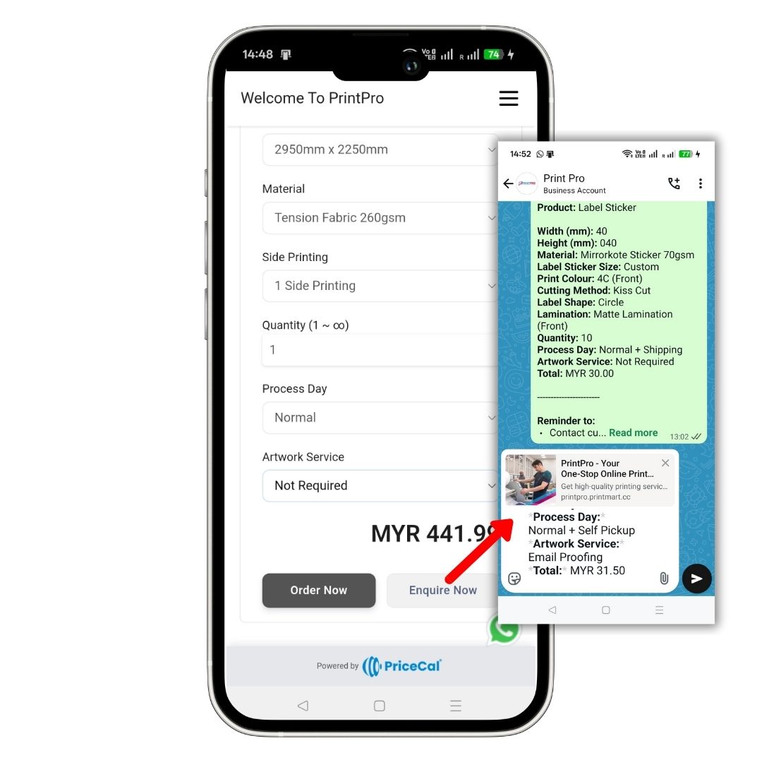 Printalogue provides instant pricing and a seamless inquiry process via WhatsApp, making it easy for customers to get quotes and ask questions. However, while Printalogue is a powerful tool for showcasing products and providing pricing, it doesn’t include full eCommerce checkout features in the entry-level PriceCal Lite plan.
