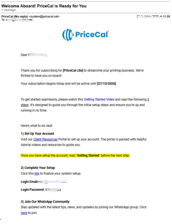 ⚠️Important: Save this email safely – it contains your login credentials for the PriceCal Dashboard.