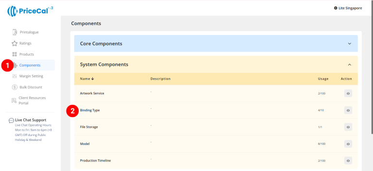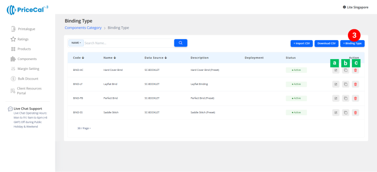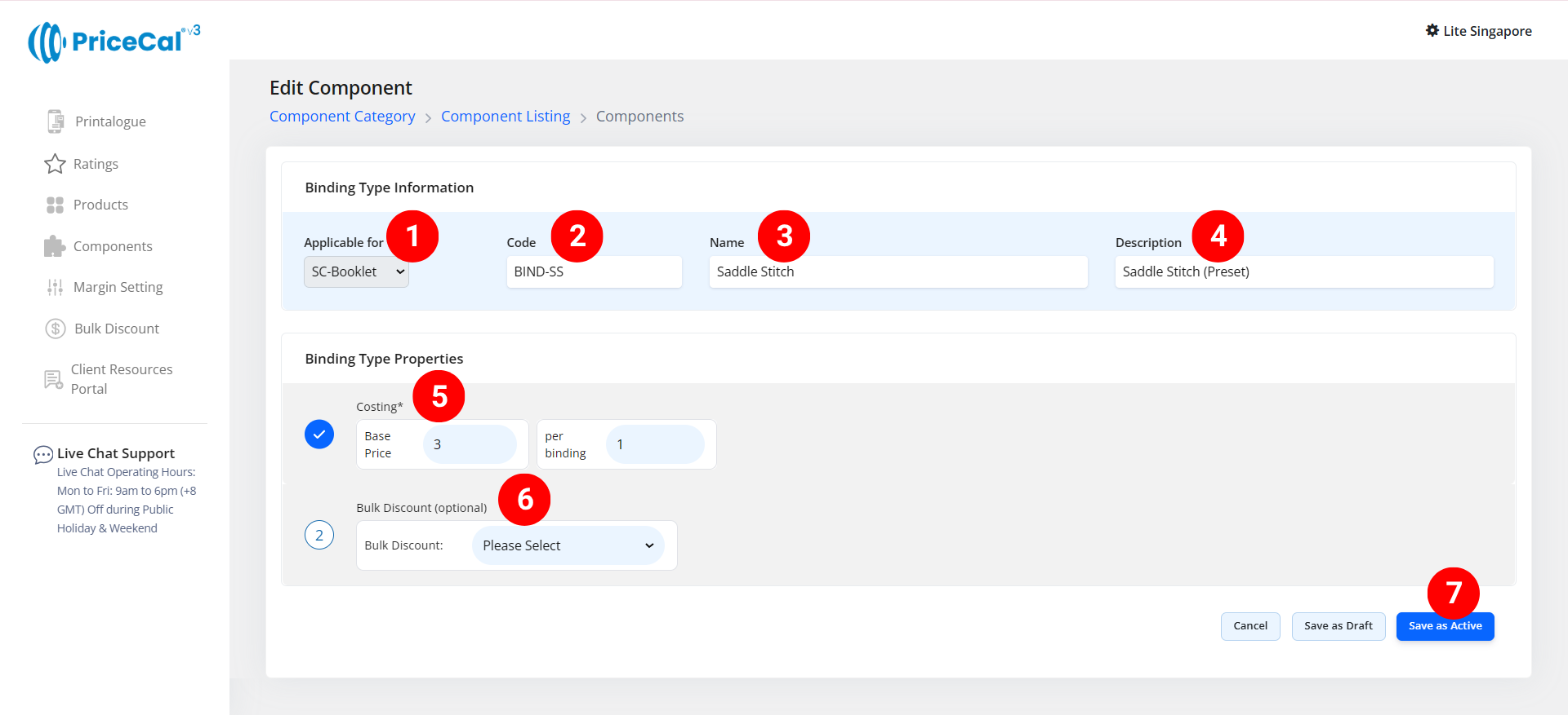 Together with Printing Size, Printing Cost, and Material, the Binding Component completes the pricing structure for SC-Booklet products in PriceCal.