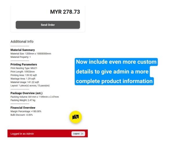 We've upgraded the "Additional Information" section with comprehensive production details for printers, including package overview, material summary, printing parameters (nesting type, print length, wastage), layout specifications, and financial breakdown with margin and discount calculations.