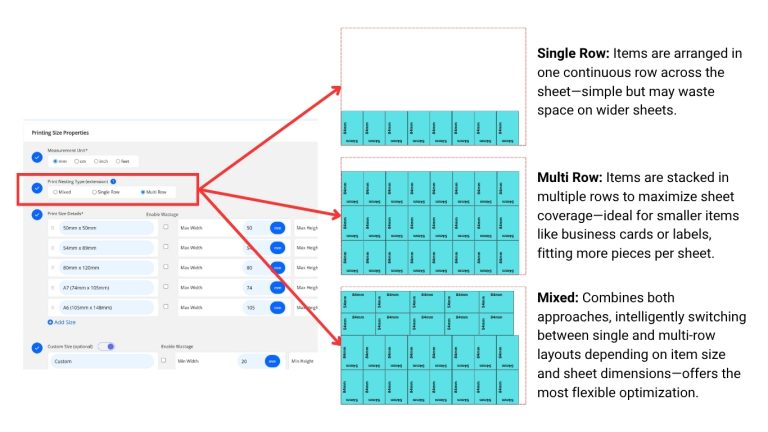New nesting modes give you precise control over how jobs are arranged on your print sheets: Single (one orientation per sheet), Multi (same orientation repeated), or Mixed (different orientations combined on one sheet). PriceCal automatically rotates orientations to achieve the best yield.