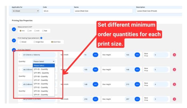 Applicable to SC-Sheet only. You can now set minimum order quantities specific to each print size. For example, require 100pcs minimum for A4 orders and 200pcs minimum for A5 orders—each size gets its own quantity rules.