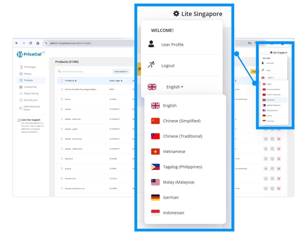 Your PriceCal dashboard now supports multiple languages including English, Malay, Chinese, Vietnamese, and more. Simply select your preferred language from the settings to view the entire interface in your chosen language.