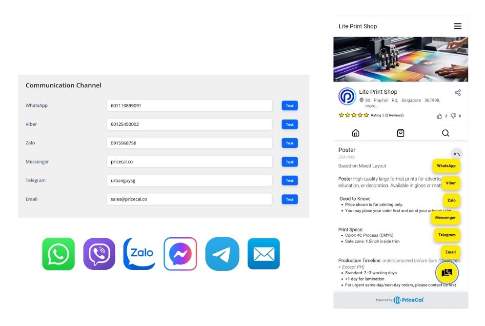 Your Printalogue storefront now supports additional messaging platforms including Zalo, Messenger, Viber, and more. Customers can reach you through their preferred communication app.