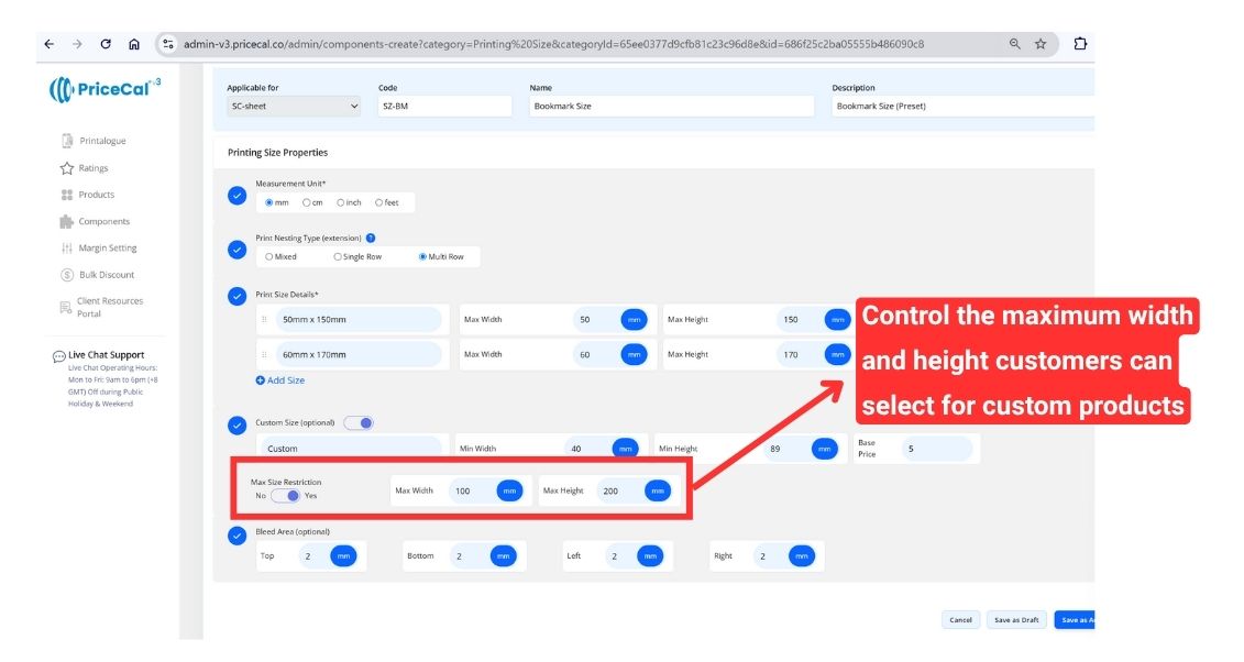 You can now set minimum and maximum size limits for custom dimension products. Control exactly what size ranges customers can order directly from your Printalogue storefront.