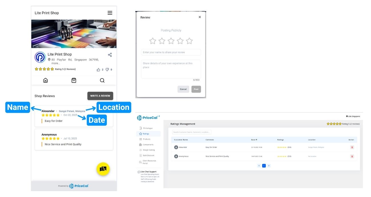 Reviews on your Printalogue storefront now show more credibility-building details including reviewer name, location (detected via IP), and review date. We've also updated both the frontend and backend UI/UX for a cleaner, more professional look.