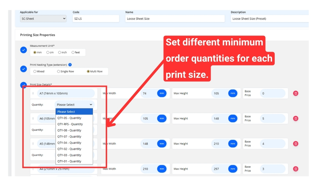 Applicable to SC-Sheet only. You can now set minimum order quantities specific to each print size. For example, require 100pcs minimum for A4 orders and 200pcs minimum for A5 orders—each size gets its own quantity rules.
