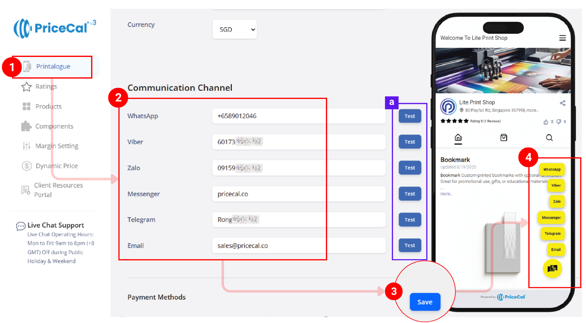 Communication Channels are the contact methods you provide to customers on your Printalogue storefront. These channels allow customers to reach you for inquiries, support, custom quotes, or order-related questions through their preferred method of communication.