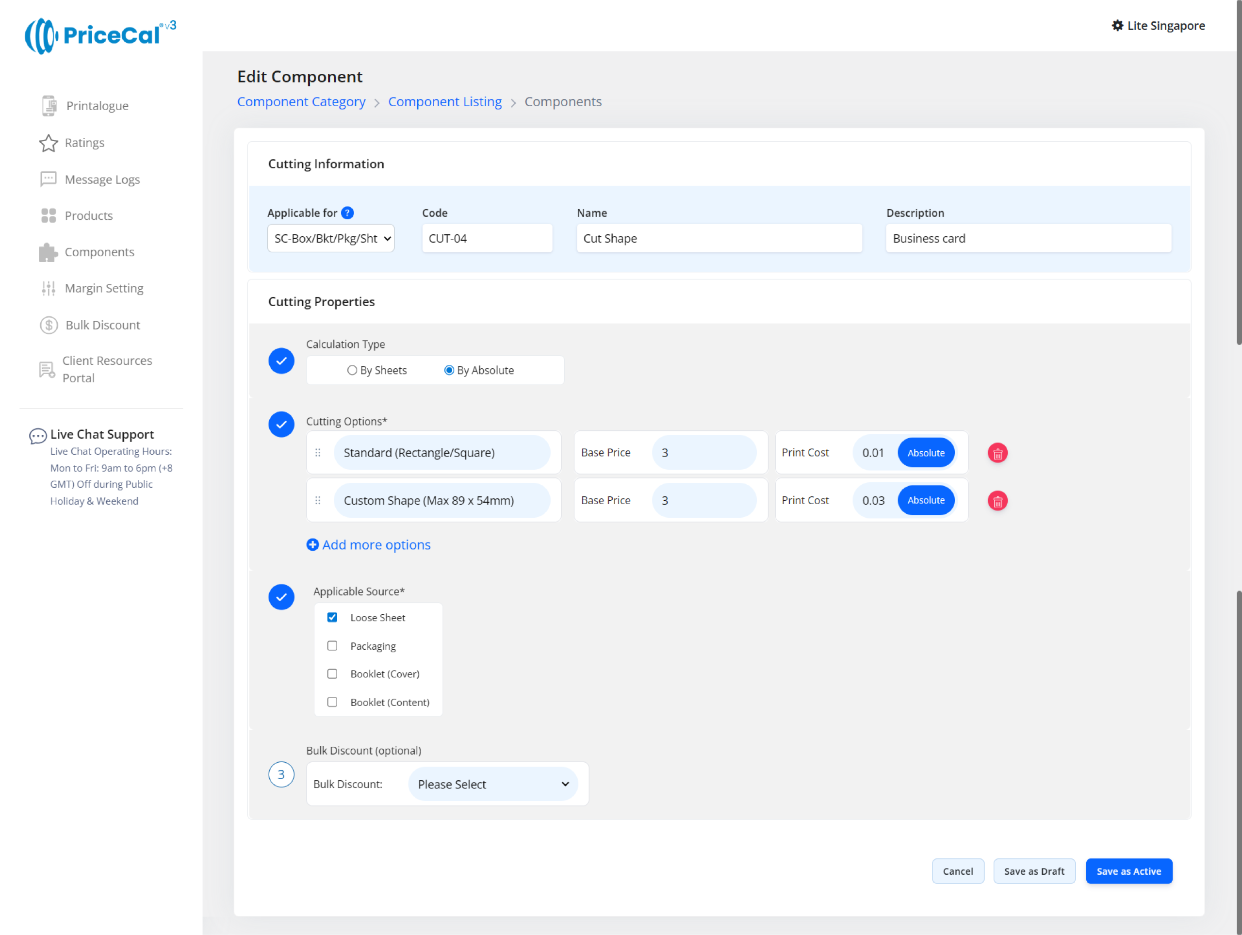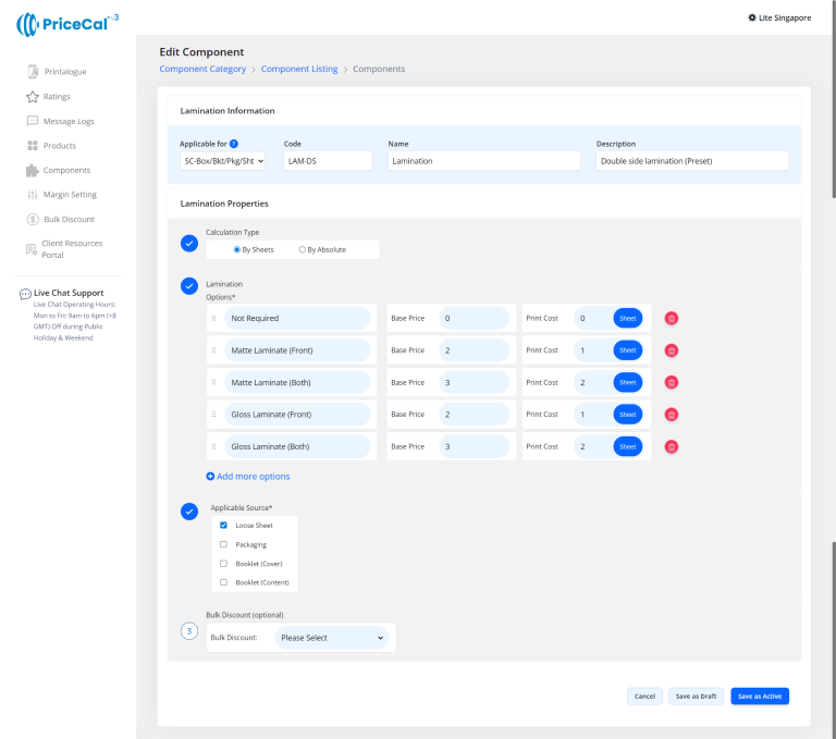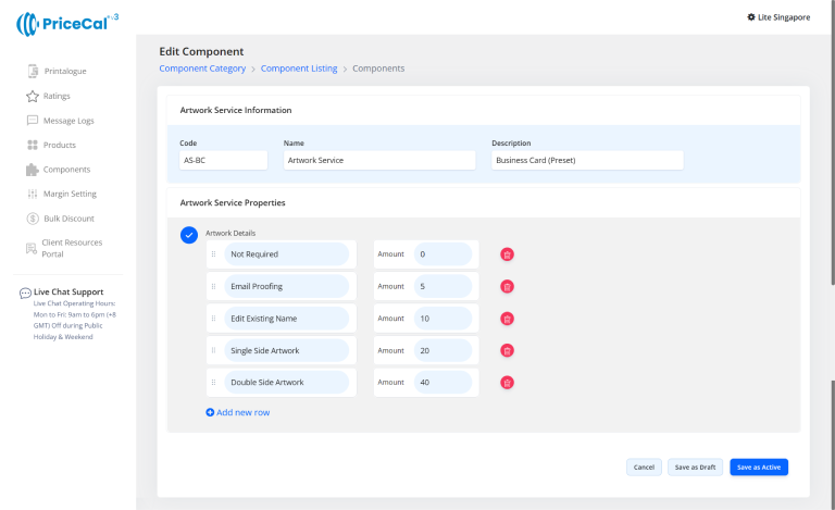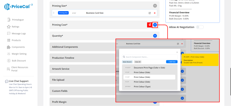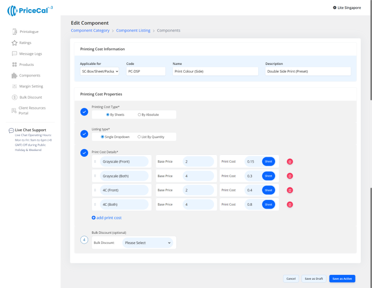 This image shows how a double side printing cost (printing colour/side) component is typically set up for business card or the other products can be double side printed, so you can understand what each field means before creating your own.
