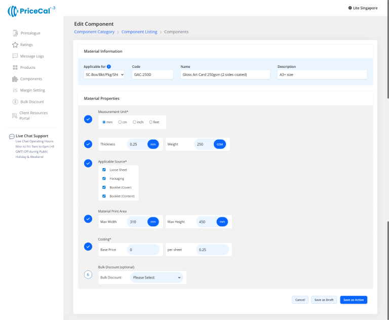 Tips 💡: You can add unique components to a material.For example, if custom component lamination cannot be used on all materials, then we need to attach the lamination component under the applicable materials.