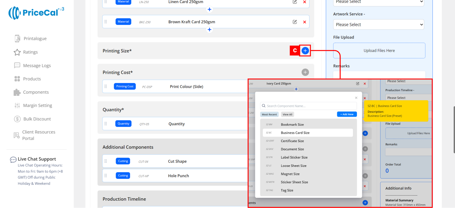 - Material Summary – Shows the maximum print area of the material selected in the Price Calculator.