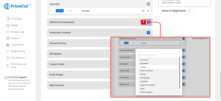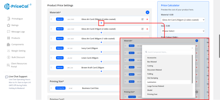 Custom Component: choose the finishing component category like Lamination, Rounded corner. And add the component.