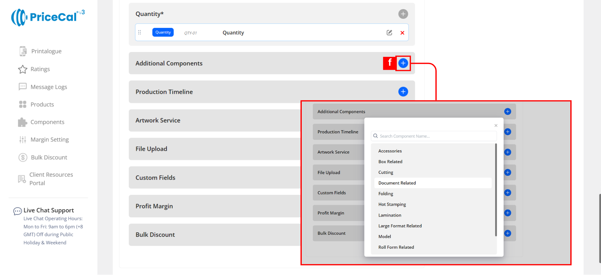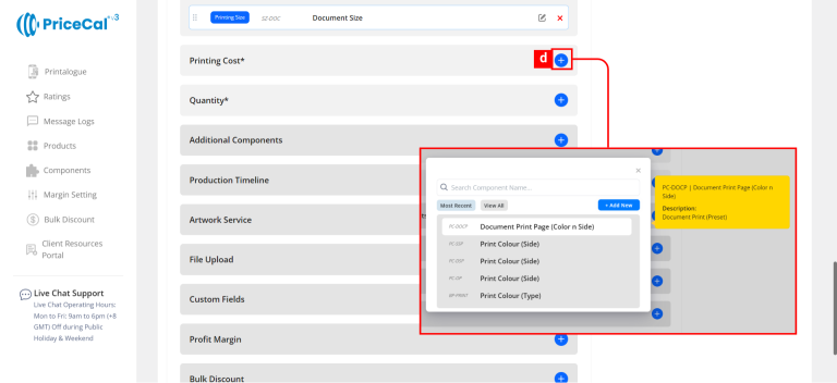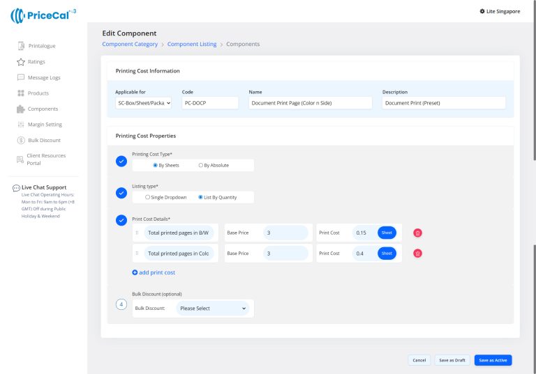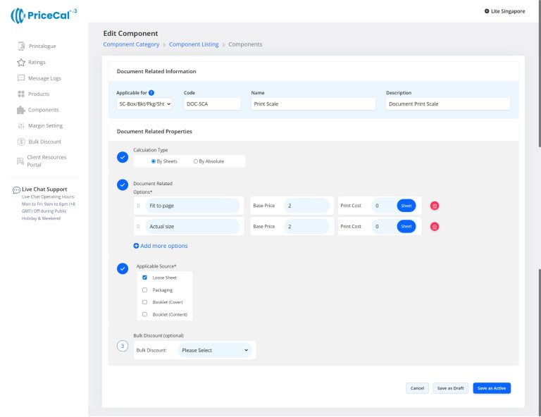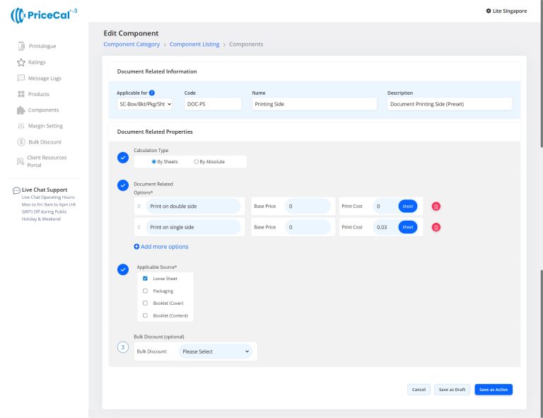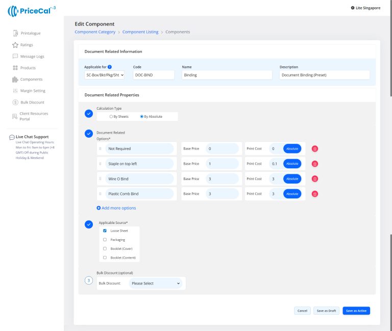 Custom Component: choose the finishing component category like Print Side, Binding. And add the component.