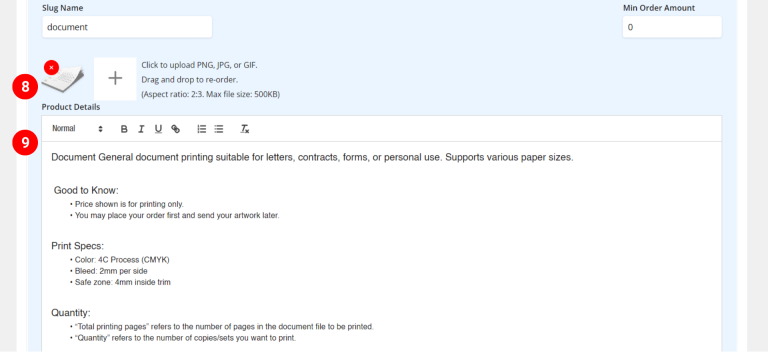 Example: If you select a print price of $9, but the minimum order amount is $15, then this order will be charged $15 unless the print price is higher than $15.7. Enter the slug name: document