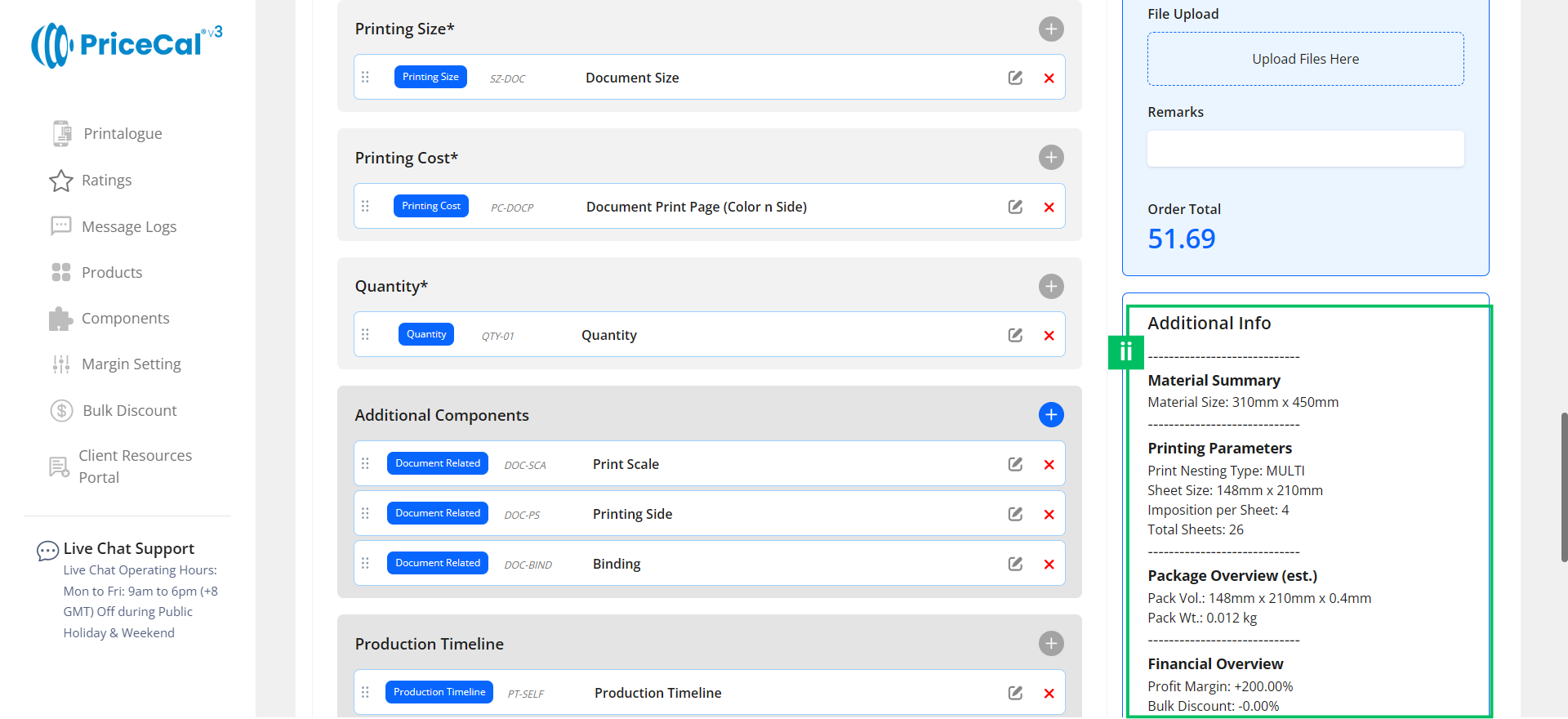 - Financial Overview – Summarizes the applied profit margin and any bulk discount applied.