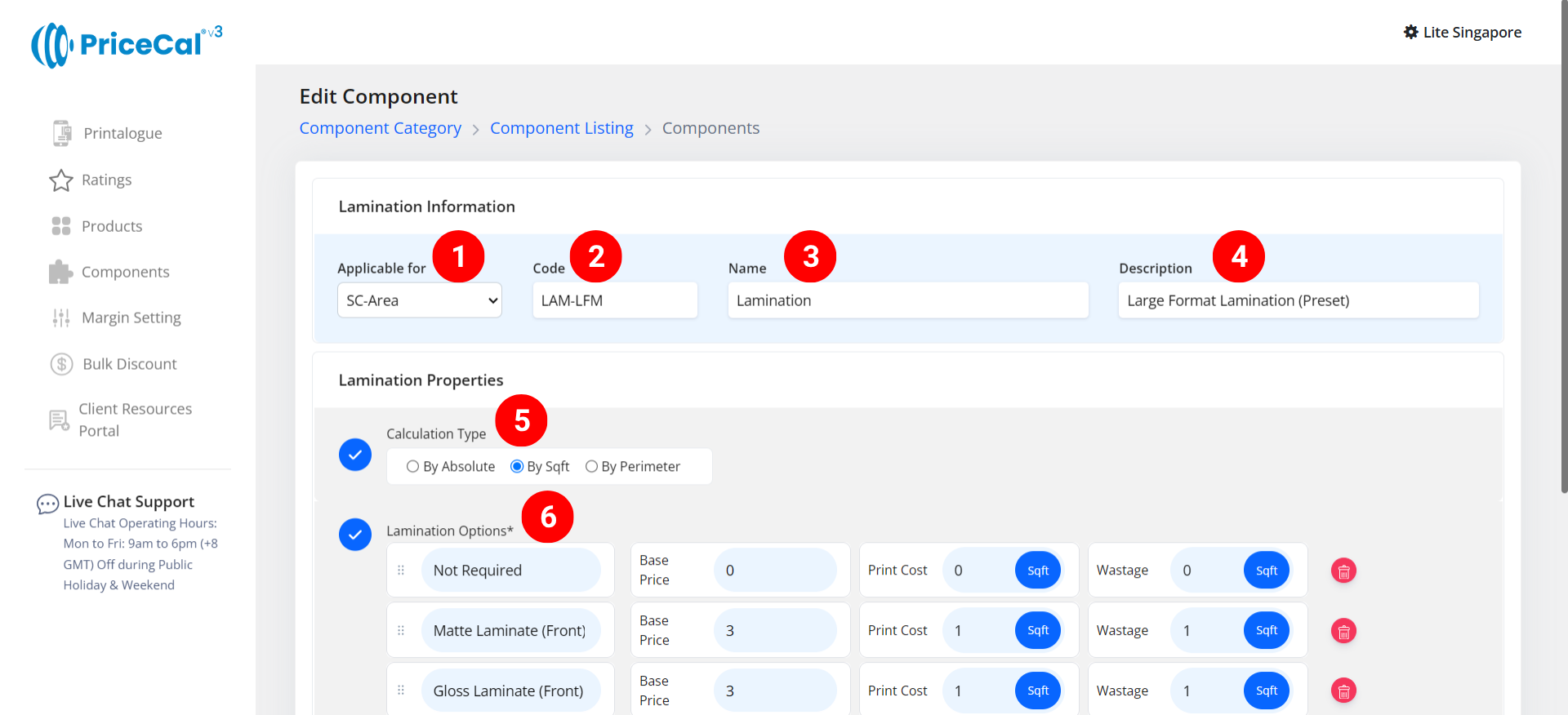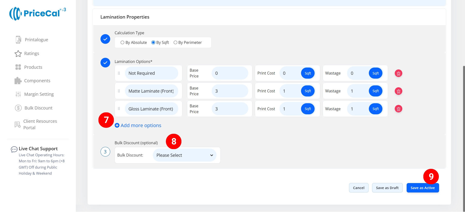 💡 Example: When lamination cost per sqft is high for smaller jobs, apply a bulk discount for larger print areas to reduce the per-unit cost. -
