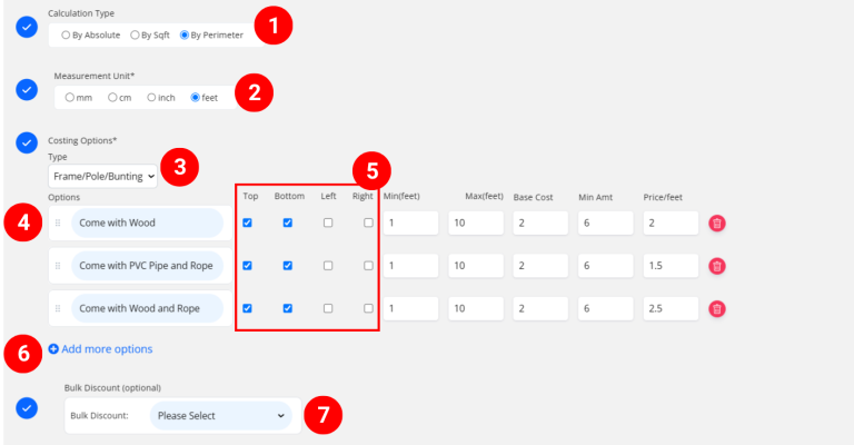 Example: When finishing / pole cost per length is high for smaller jobs, apply a bulk discount for larger finishing to reduce the per-unit cost.