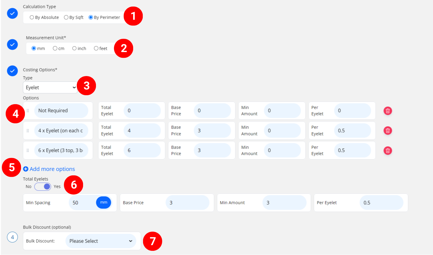 Example: When eyelet cost per piece is high for smaller jobs, apply a bulk discount for larger eyelet quantity to reduce the per-unit cost.
