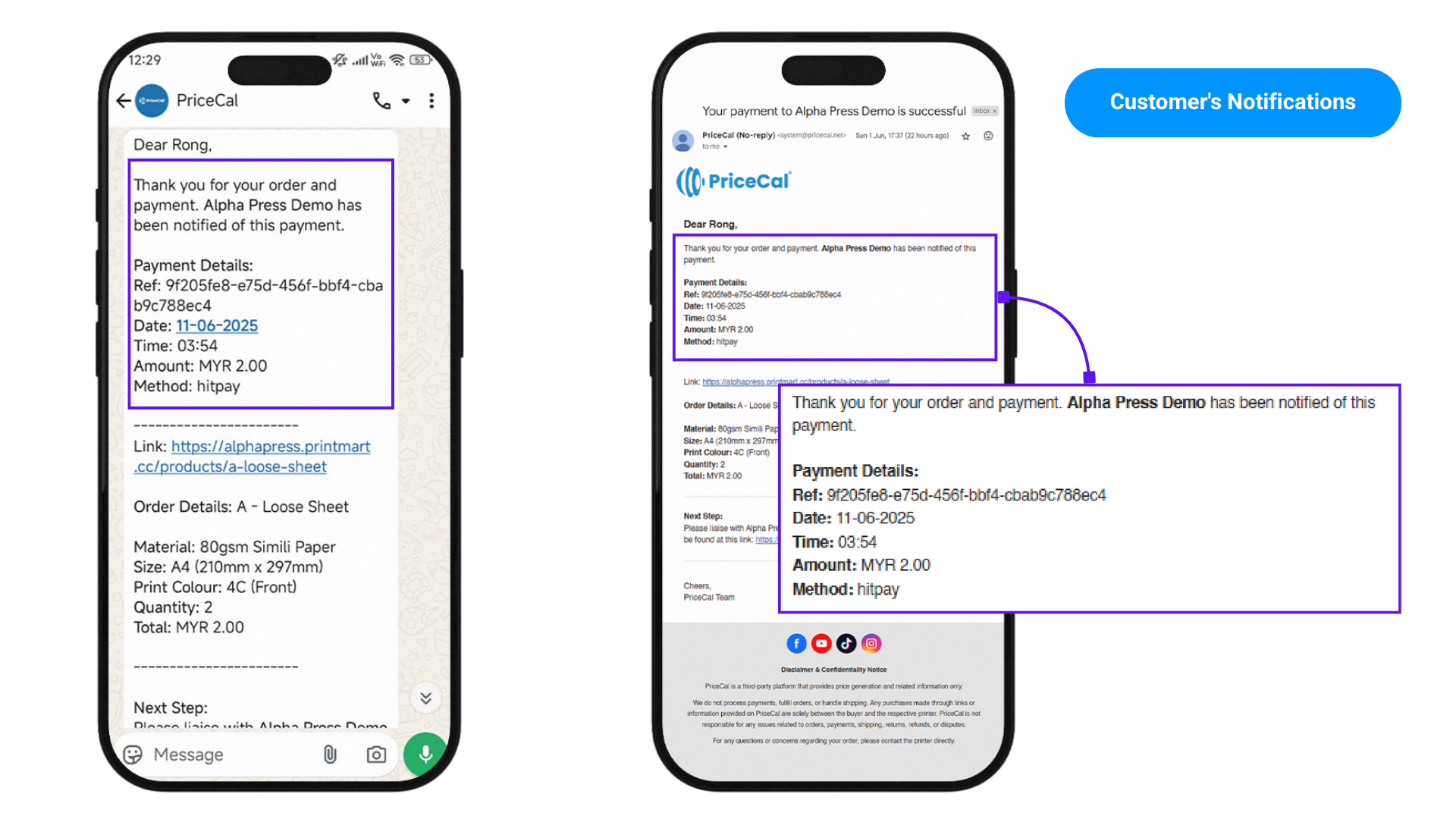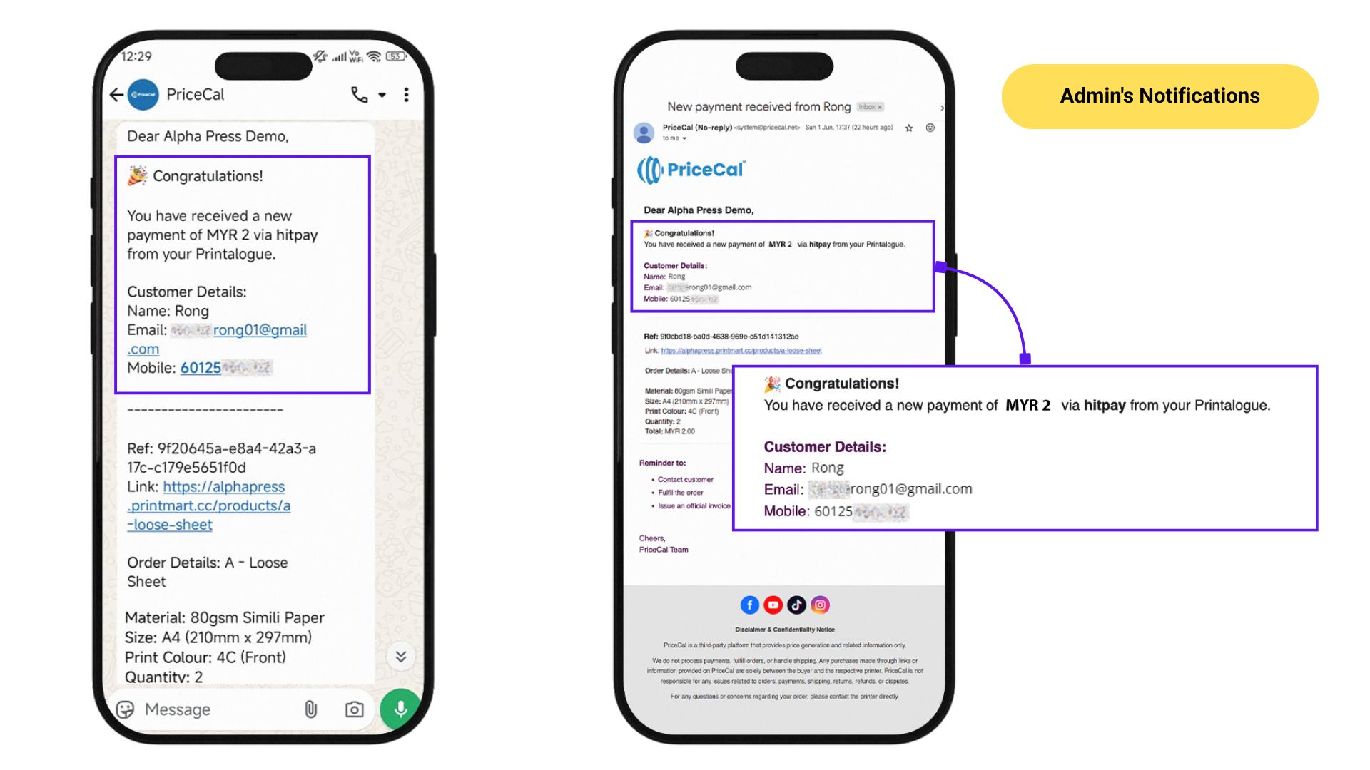 Upon successful payment, both Admin and the customer will received notification via email and WhatsApp (if valid), containing the order details.