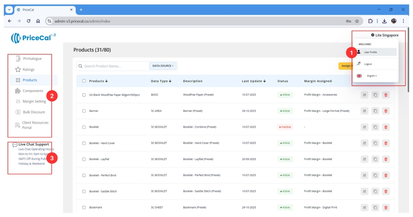 (1) Your Profile and Language Selector Access your account settings and switch between languages