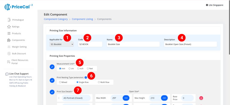 For multi-page products like booklets, catalogs, and magazines, defining the printing size ensures PriceCal calculates accurate production costs and nesting for folded pages.
