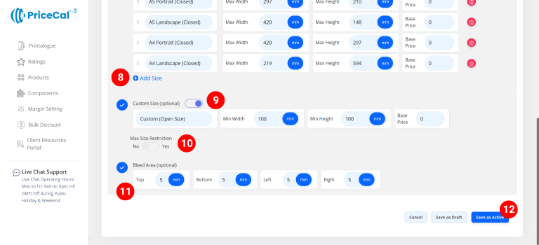 – Min Width & Height: Enter the min open booklet size that can be printed and cut for this product size.