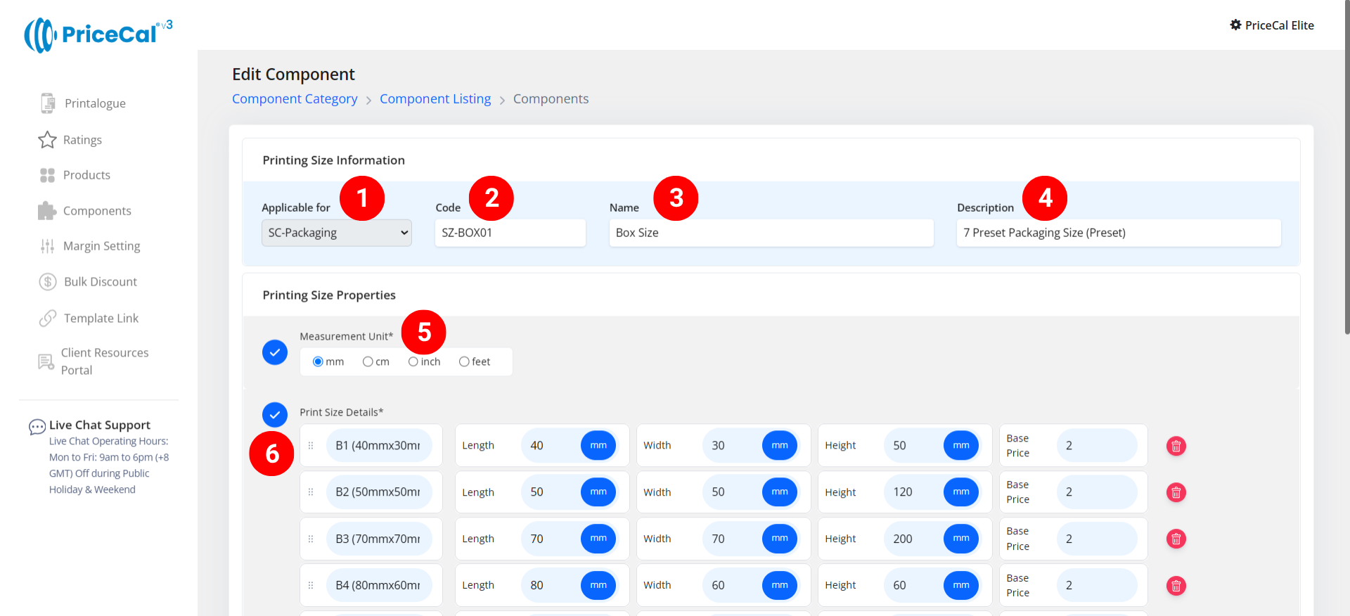 After completing your Printing Size, proceed to set up the Printing Cost and Quantity components to complete your product’s pricing flow.