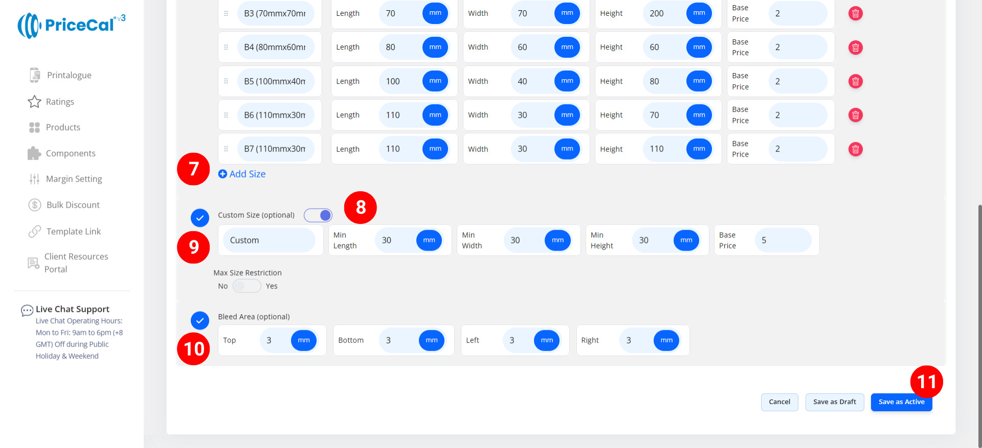 – Min Length & Width & Height: Enter the min size that can be printed and cut for this product size.