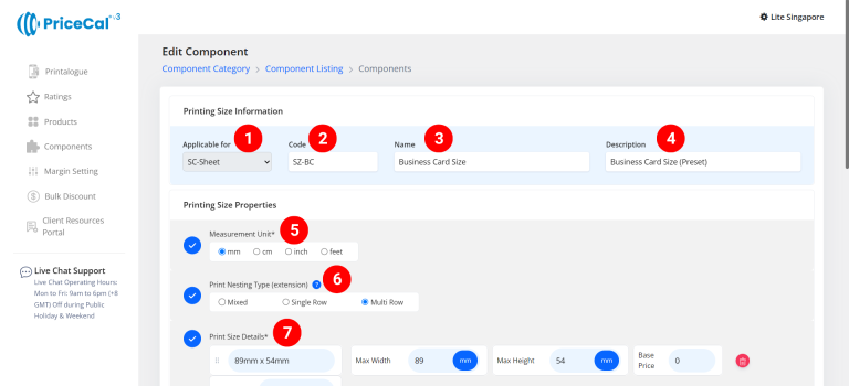 After completing your SC-Sheet Printing Size, proceed to set up the Printing Cost and Quantity components to complete your product’s pricing flow.