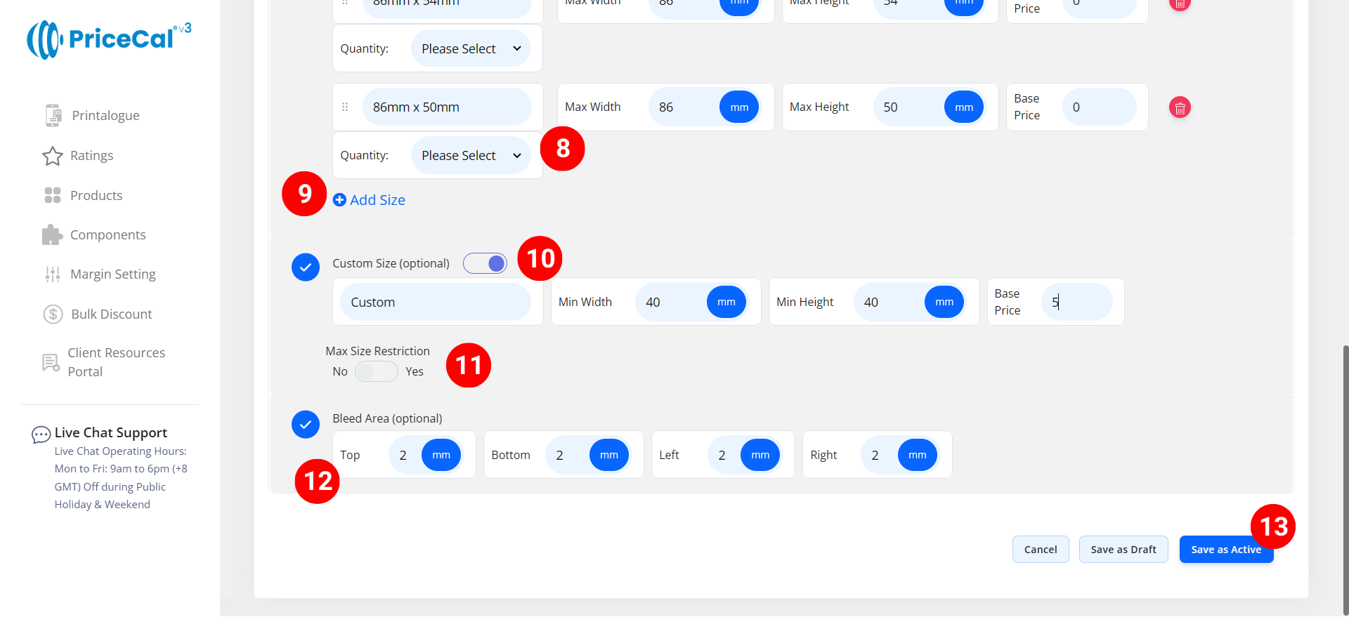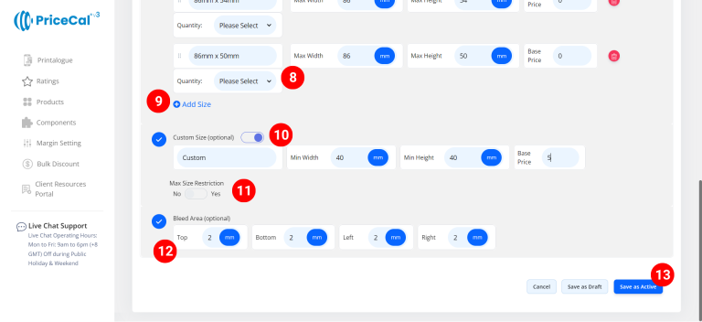 For sheet-based products like business cards, flyers, and stickers, defining the printing size ensures PriceCal calculates the correct sheet usage, nesting, and print cost automatically.