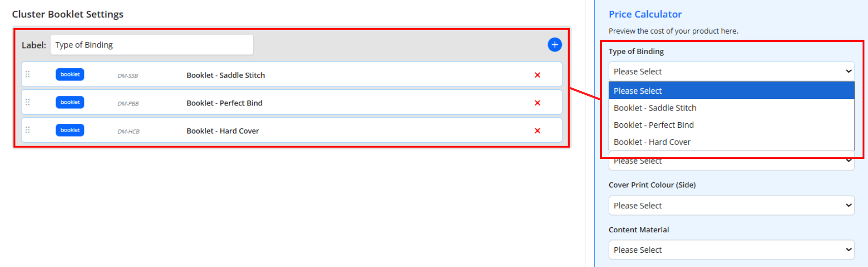 💡 Tip: Normally, each booklet product can only contain one binding type. Use Cluster only when you want to group multiple bindings (e.g., Saddle Stitch + Perfect Bind).