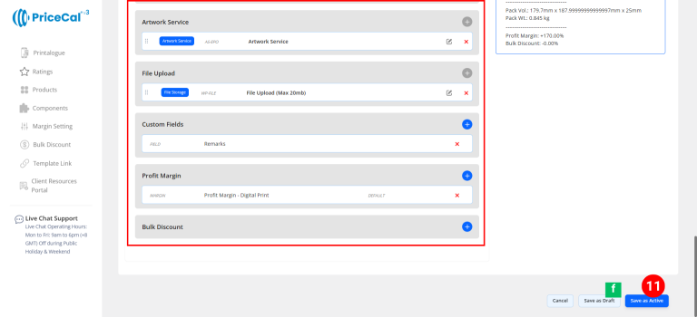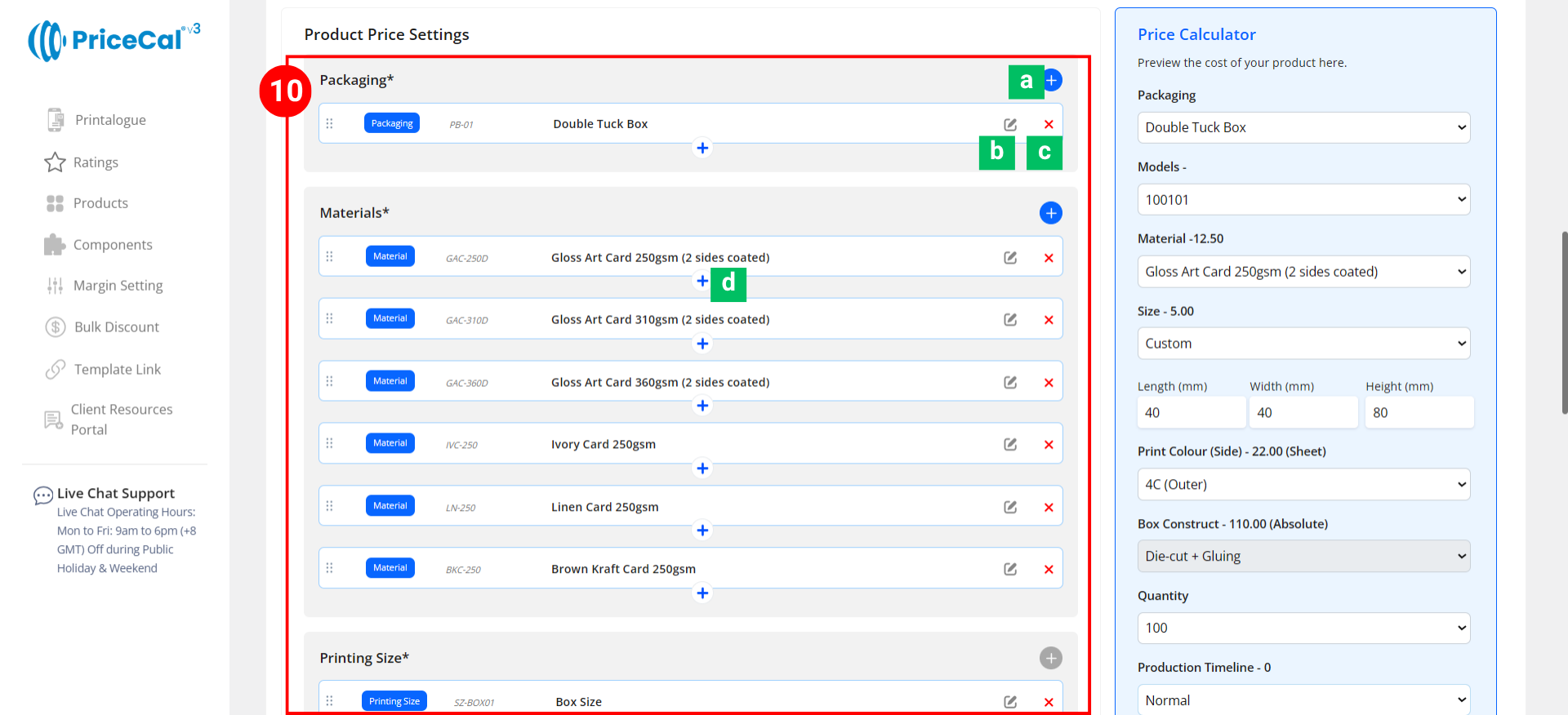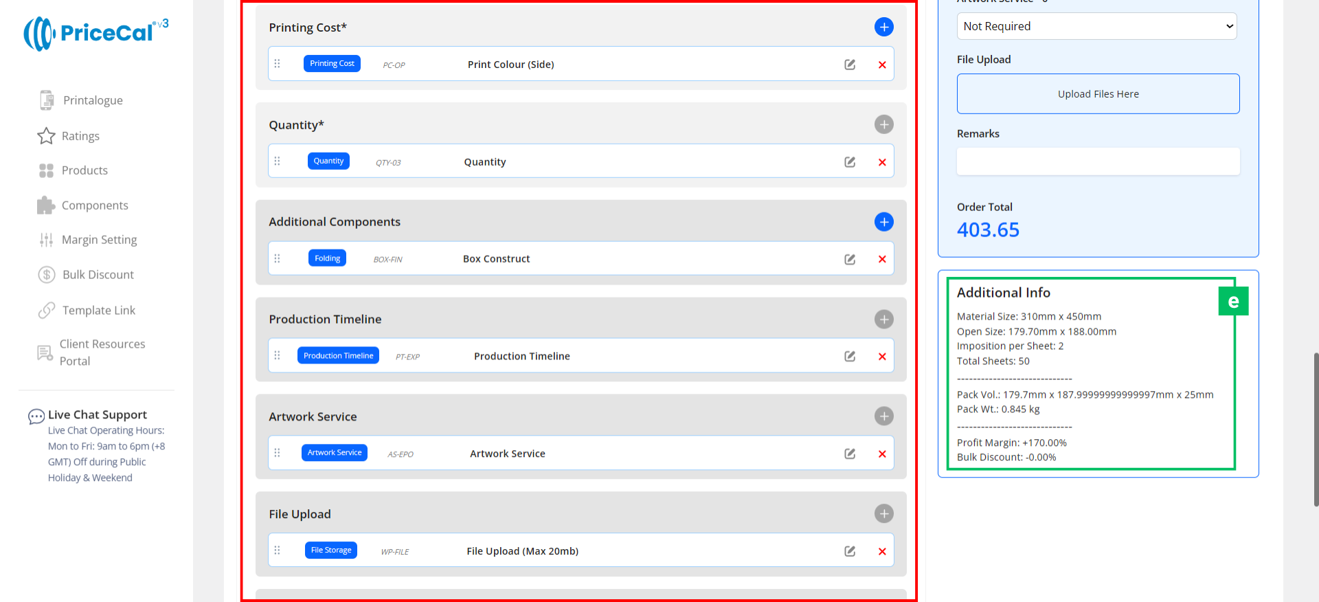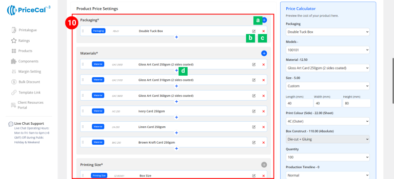 - Add Nesting Component for Material [d]: Add sub-components under a main one. Example: Add “Lamination” under “310gsm Art Card” so it only appears when that material is selected.