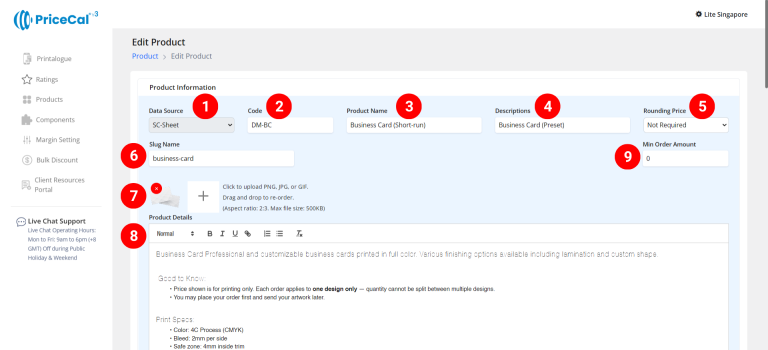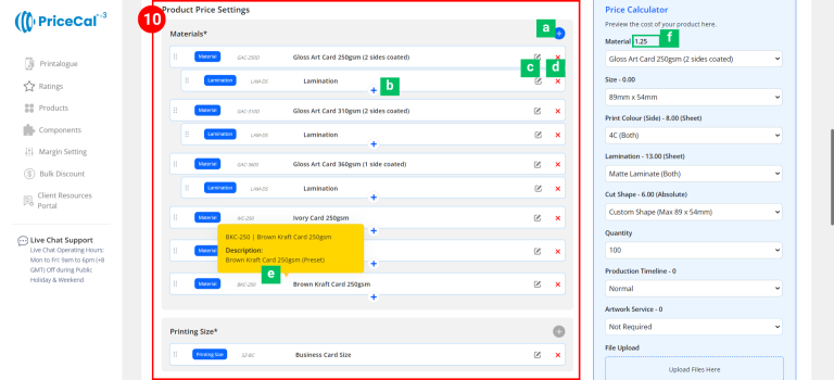 Material – Define the printing material (e.g., 310gsm Art Card, 128gsm Gloss Paper).