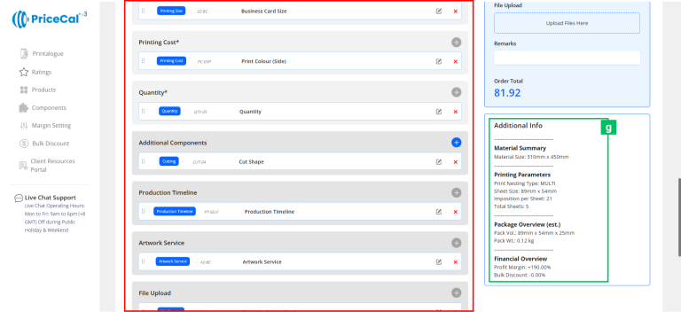 Add Nesting Component for Material [b]: Add sub-components under a main one. Example: Add “Lamination” under “310gsm Art Card” so it only appears when that material is selected.