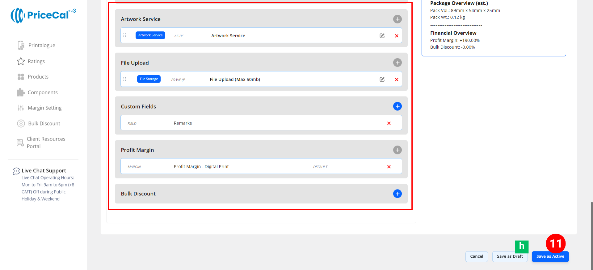 Test the cost preview under “Component Cost” before activating the product.