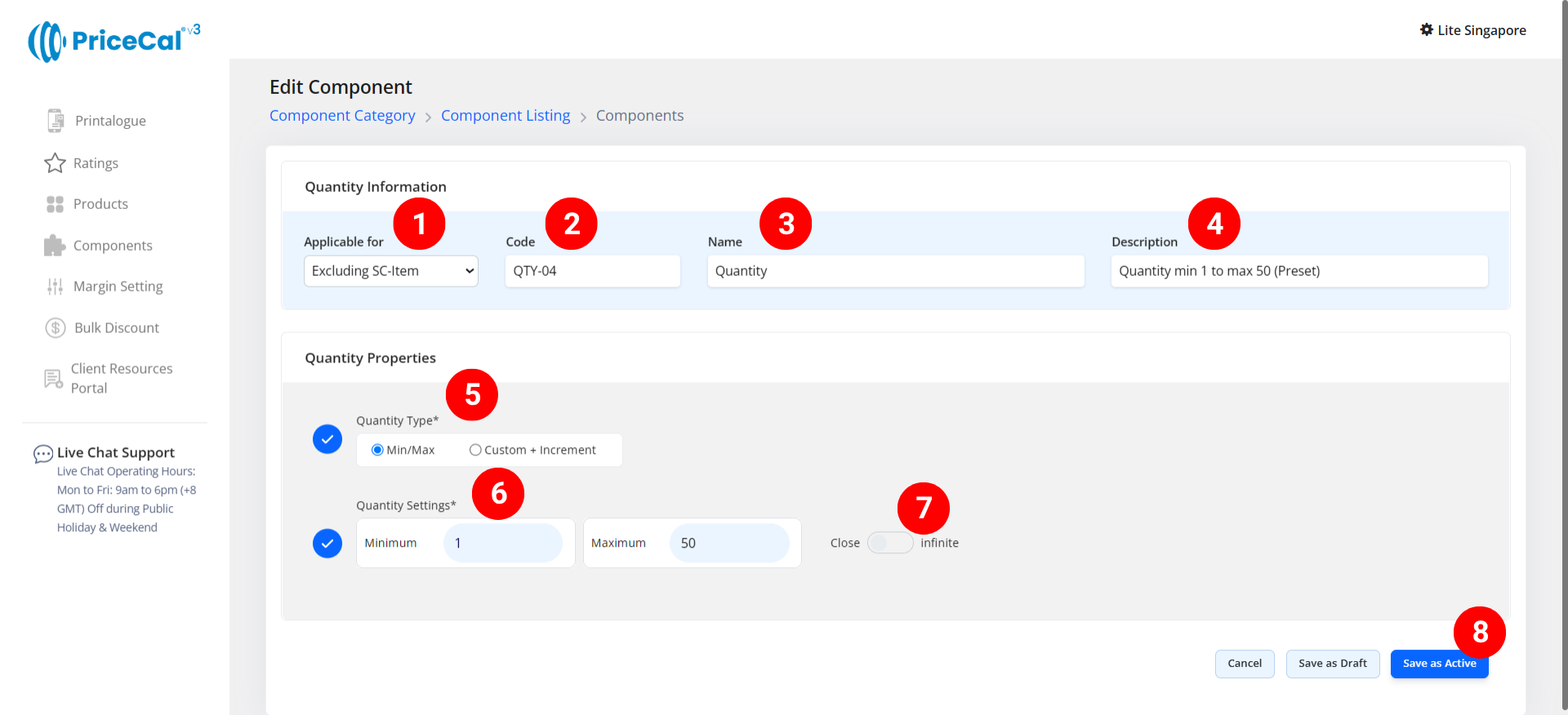 In PriceCal, the Quantity Component helps you define flexible or preset quantity ranges that customers can select when ordering from your Printalogue.
