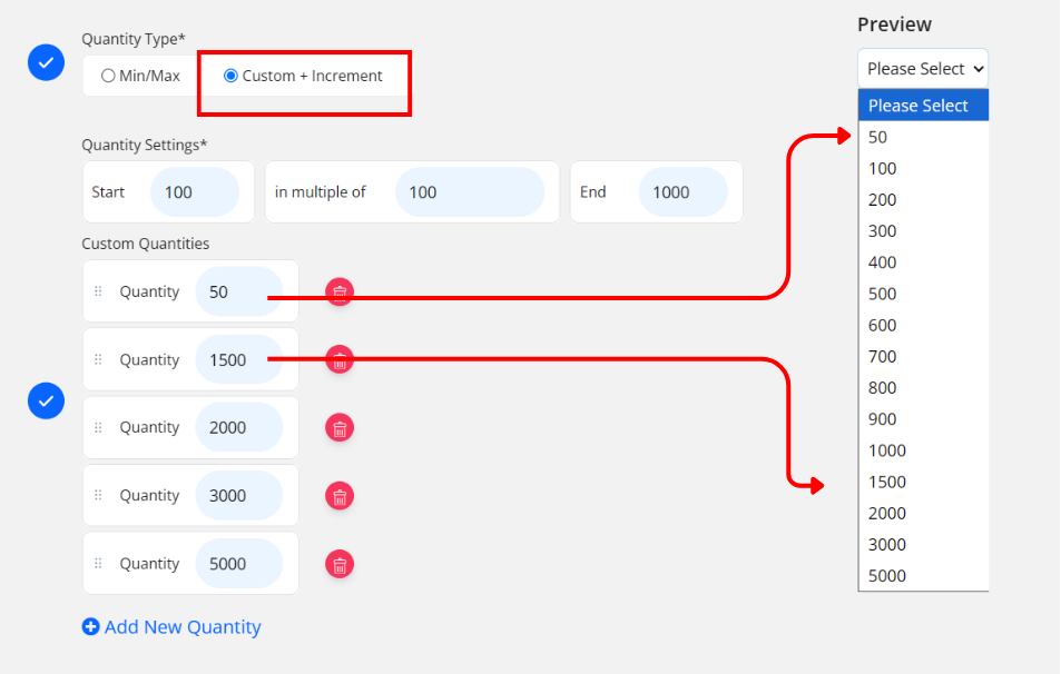 – Custom + Increment: System automatically generates preset quantities based on your settings.💡 Example Custom + Increment: Start from 100 pieces, increment by 100 , end until 1000→ customers see options: 100, 200, 300, until 1000. You can also add custom quantity number like 50, 1500, 2000, 3000 and 5000.