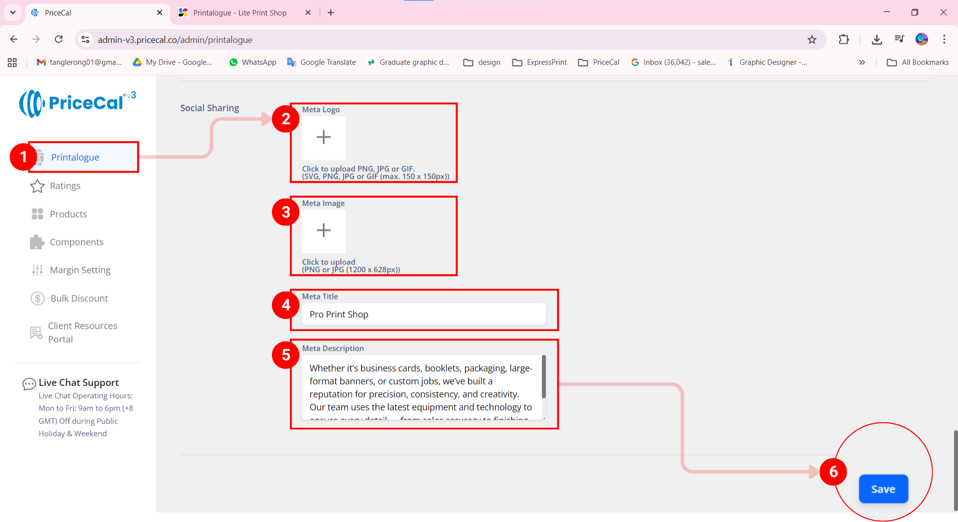 Social Sharing controls how your Printalogue storefront appears when shared on social media platforms like Facebook, WhatsApp, LinkedIn, and Twitter. By customizing your meta logo, image, title, and description, you ensure your store looks professional and attractive when customers share your link—driving more clicks and traffic.